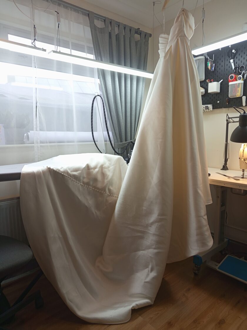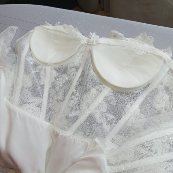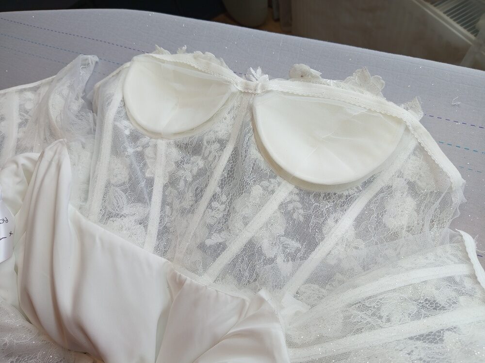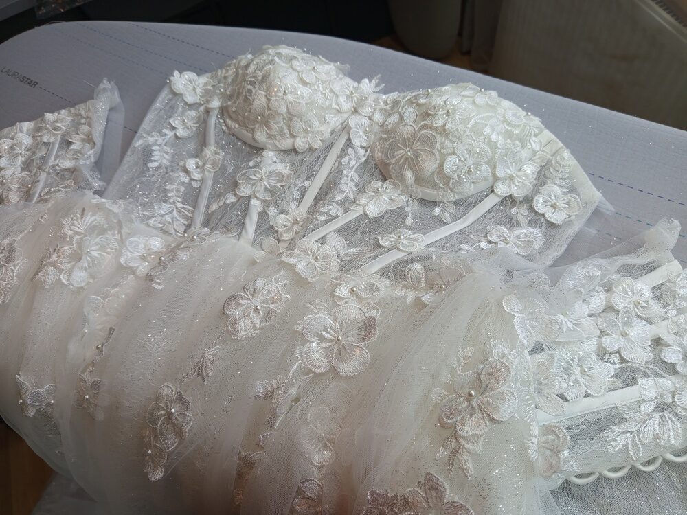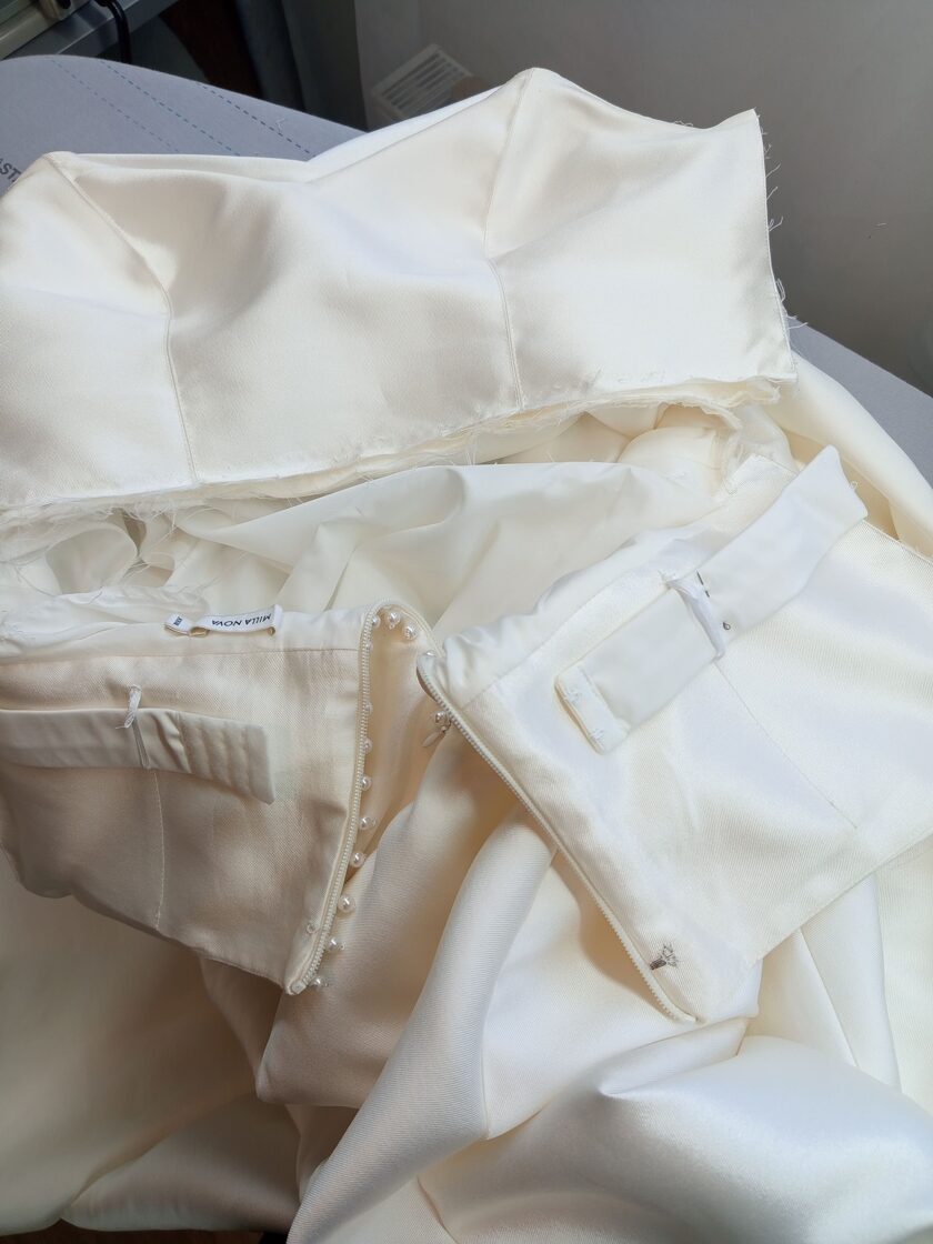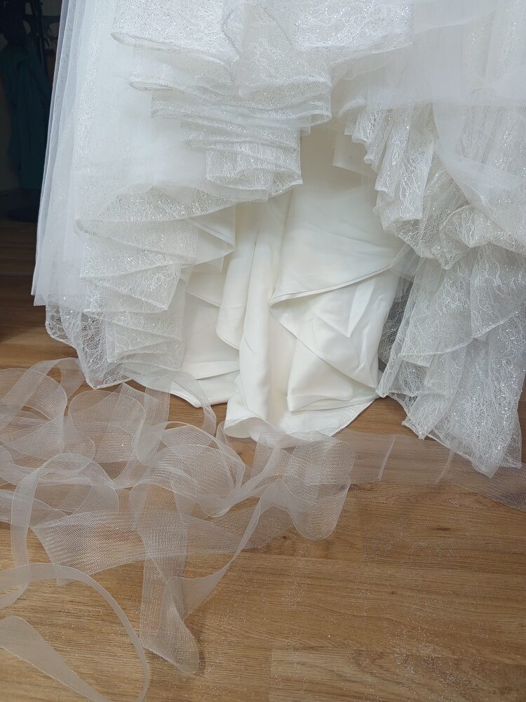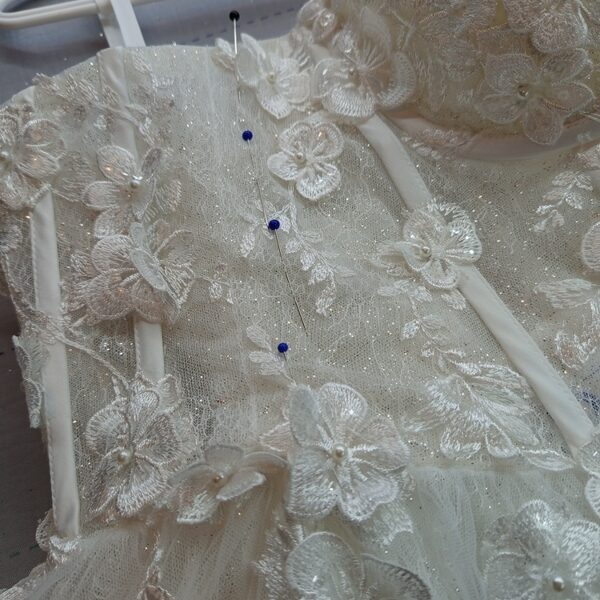To ensure the bride looked flawless on her wedding day, the side seams of this very delicate lace dress were taken in, and the hemline—which consisted of several layers—was shortened.