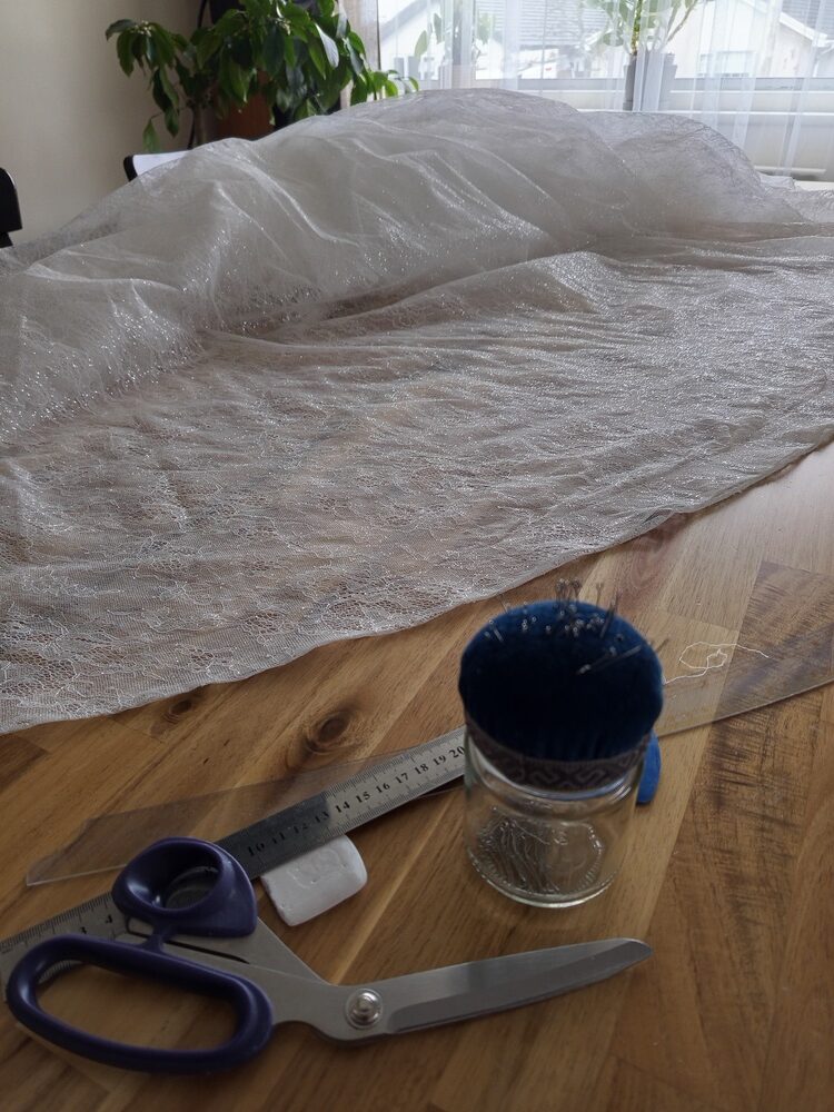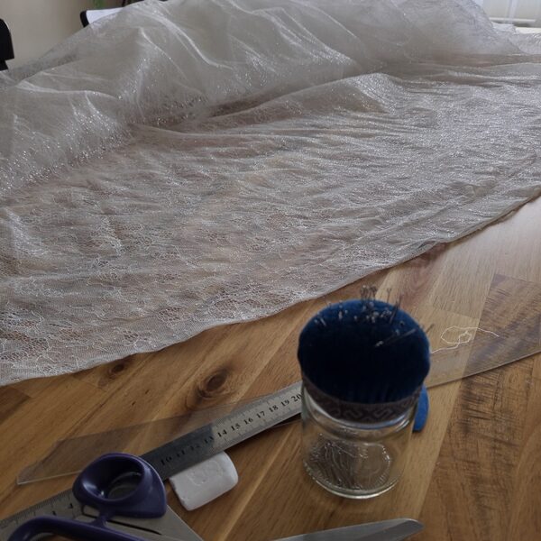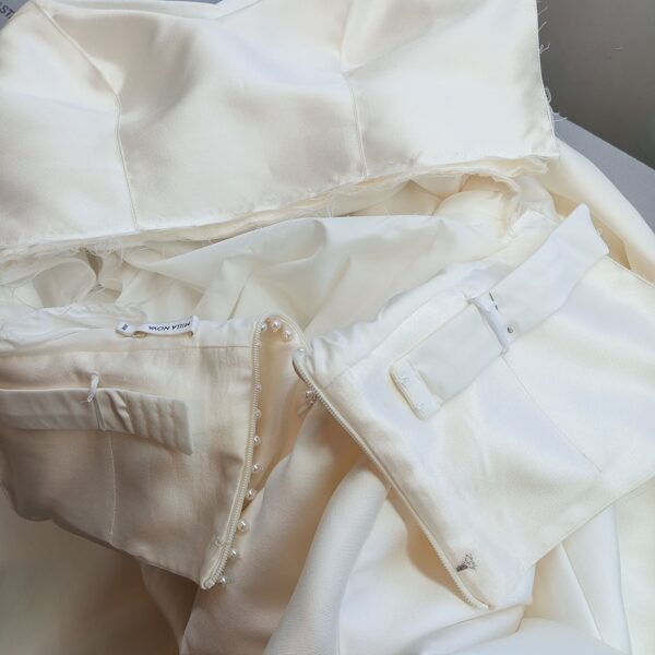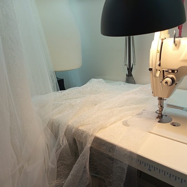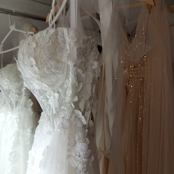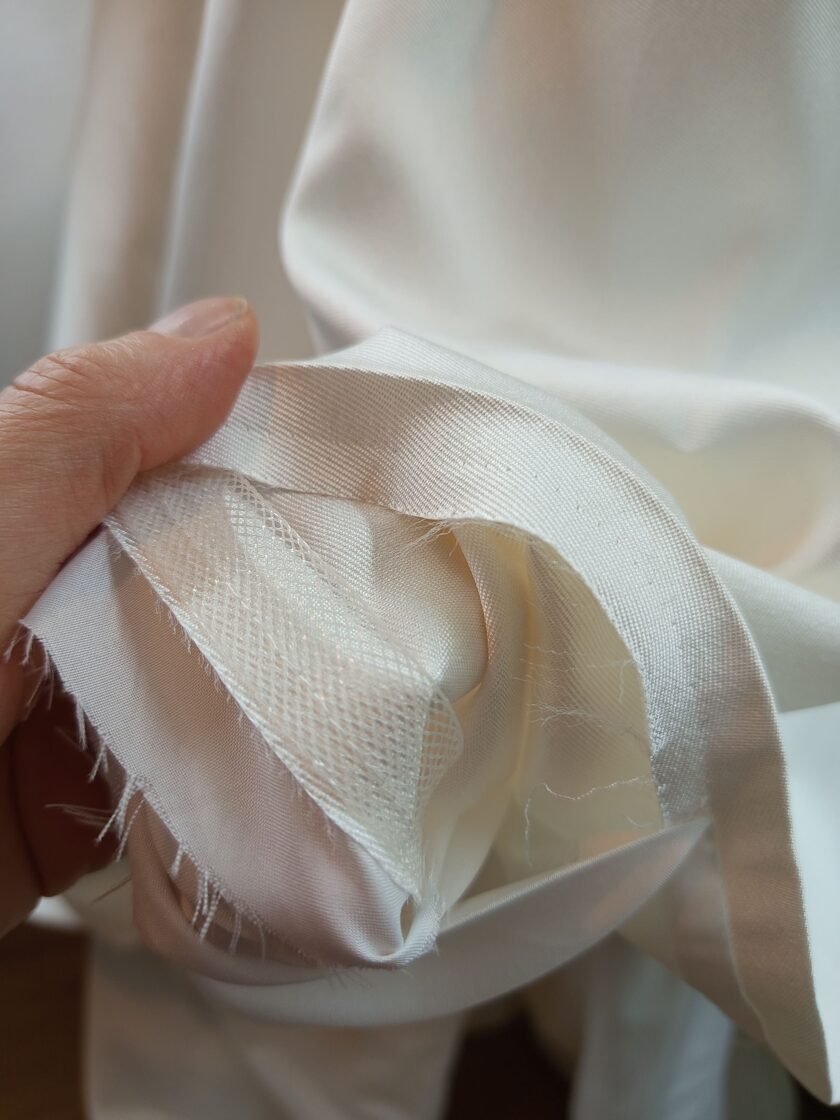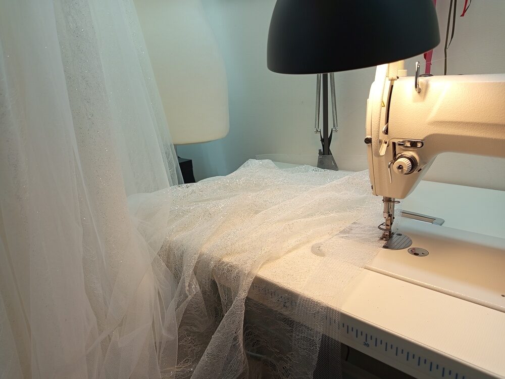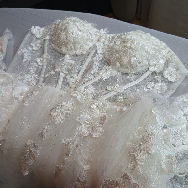 To ensure the bride looked flawless on her wedding day, the side seams of this very delicate lace dress were taken in, and the hemline—which consisted of several layers—was shortened.