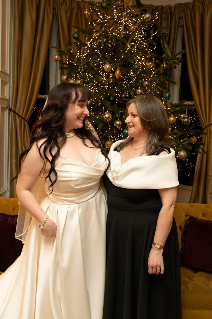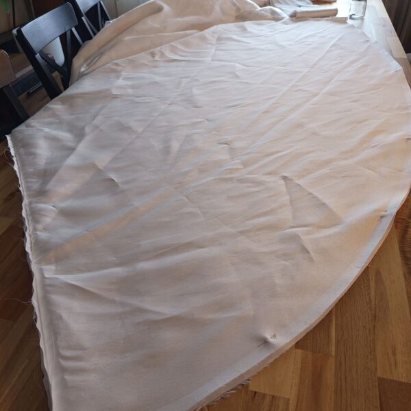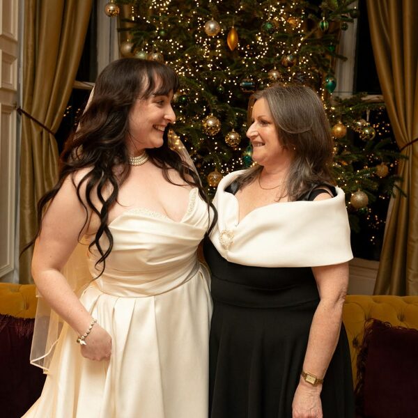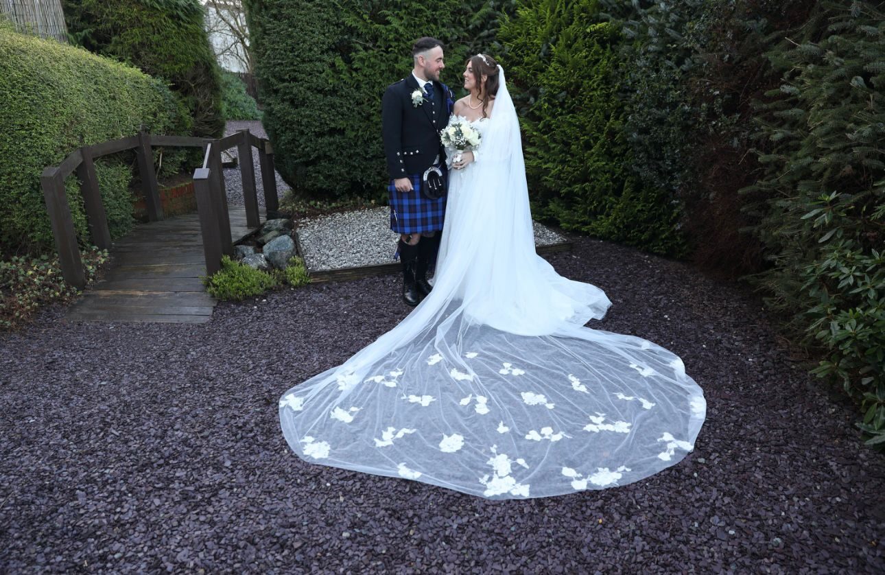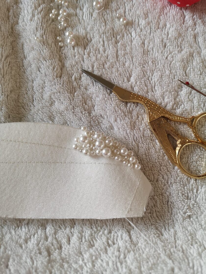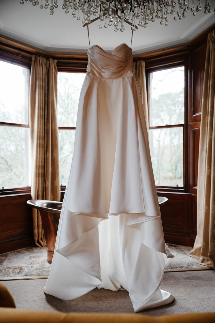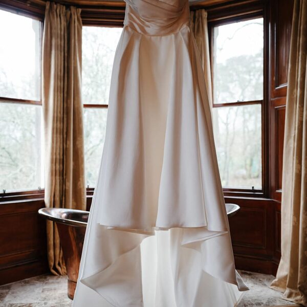 To ensure the bride looked flawless on her wedding day, the side seams of this very delicate lace dress were taken in, and the hemline—which consisted of several layers—was shortened.
