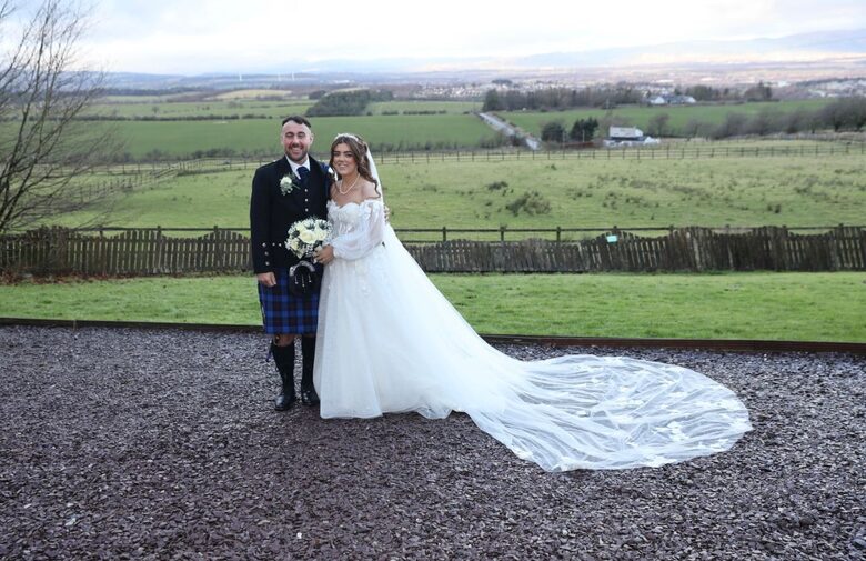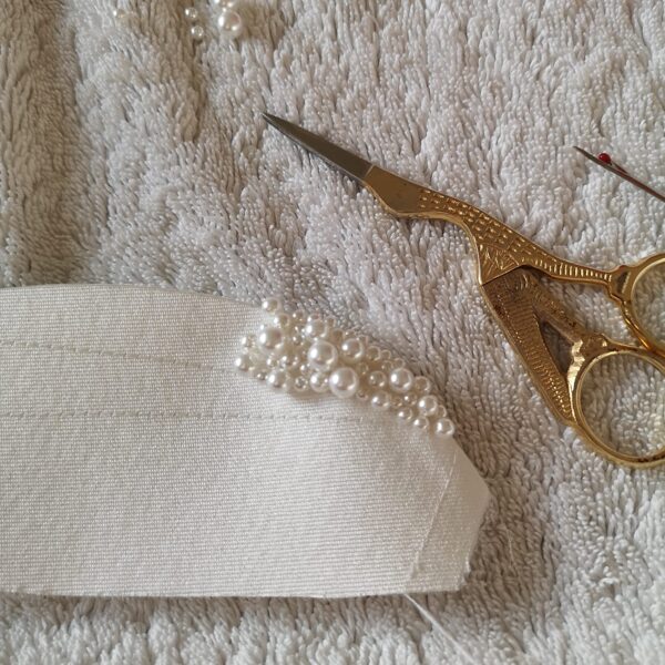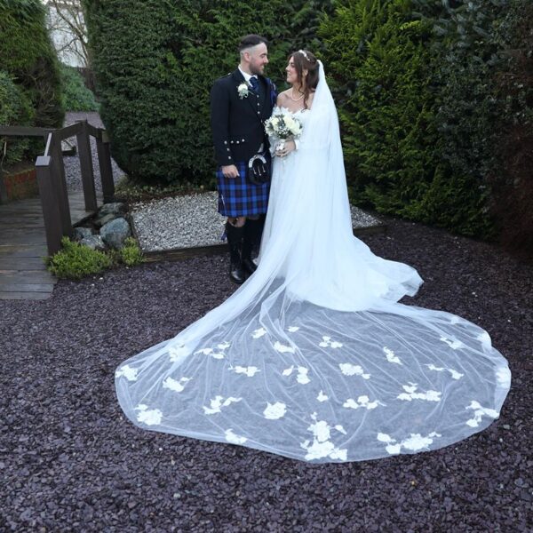 This wedding dress is a masterpiece by Milla Nova, a Ukrainian fashion design company. It was tailored to suit Adriana’s individual figure by taking in the side seams and shortening the hemline. With the help of Adriana’s mother, Bernadette—an exceptionally talented craftswoman—a decorative pearl embroidery was created on the neckline of the dress.